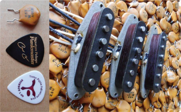 GRINNING DOGのFunkmaster TLです。ちょうどストラトのシグニチャーができた頃に、ボクの使っているFender JapanのTelecasterももっと抜けの良い音にならないかな?と思っていました。もちろんオリジナルも素晴らしいトーンでしたが、どちらかというとJazz guitarに合う感じの太い音でした。もうすでにストラトでボクの好きなトーンが出来上がっていたので、これは1発目から凄く良いトーンでした。またリアが抜けが良いですが、細くない事です。でも太すぎないこと。ここからボクのフロントとリアのバランスのこだわりでまた岸本さんは、ボクがオッケーを出すまで辛抱強くがんばって頂きました。そこで生まれたのがこのFunkmaster TLです。むちゃ抜けが良いです。このテレは今では、R&Bのリズムとかに凄く適したギターになりました。コンデンサーもヴィンテージです。凄く好きなトーンですね。PS、今、Musicmasterのシグニチャーのピックアップも作っています。もうすぐできます。これも今までにない抜けが良く同時にウオームなものを岸本さんに作って頂いています。お楽しみに!